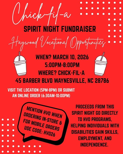 Proceeds from Chick-fil-a sales goes to HVO's Employment & Training Department, helping individuals with disabilities gain skills, employment and independence. Visit the location at 45 Barber Blvd., Waynesville and mention HVO when ordering in-store and for mobile orders (6:30 am-10:00 pm) use code: HVO26.
